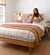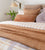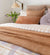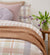 Coordinates with Linen European Pillowcase in Tea Rose, Frankie Throw in Stone, Demi Round Cushion in Lilac, Velvet Square Cushion in Stone and Linen Sheet Set in Ivory as shown, by Bambury.